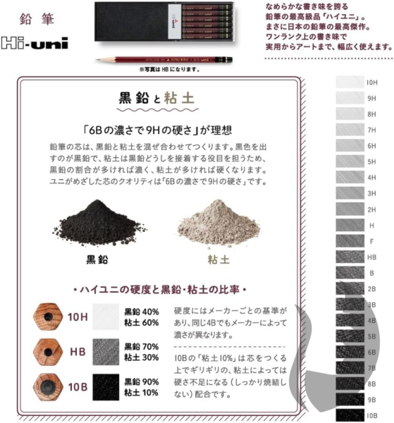 Tužka Hi-Uni obsahuje vysoce husté grafitové jádro složené z 10 miliard extrémně jemných částic, díky čemuž poskytuje rovnoměrnou, sytou a plynulou stopu. Je ideální pro detailní práci, stínování i opakované přepisování.