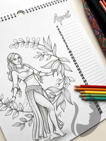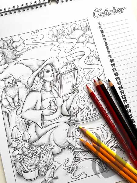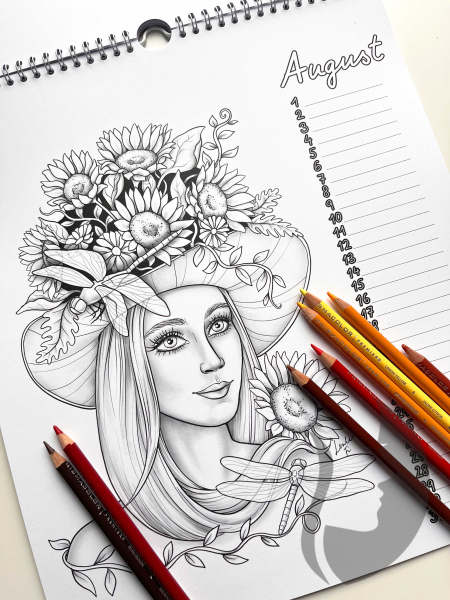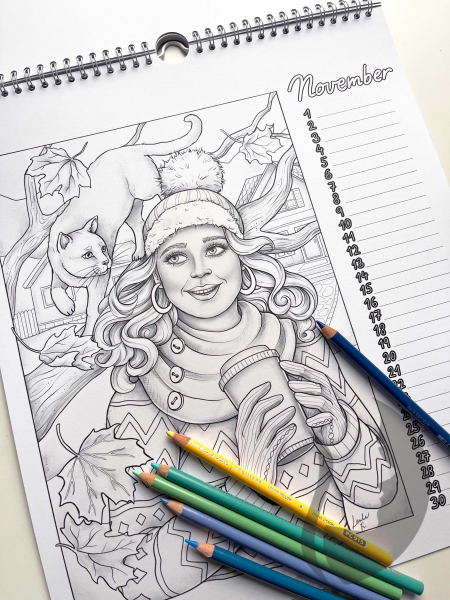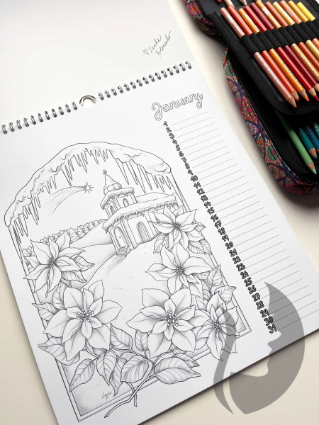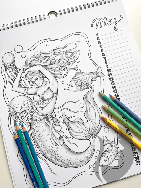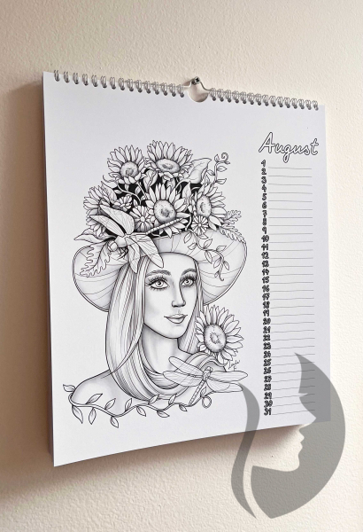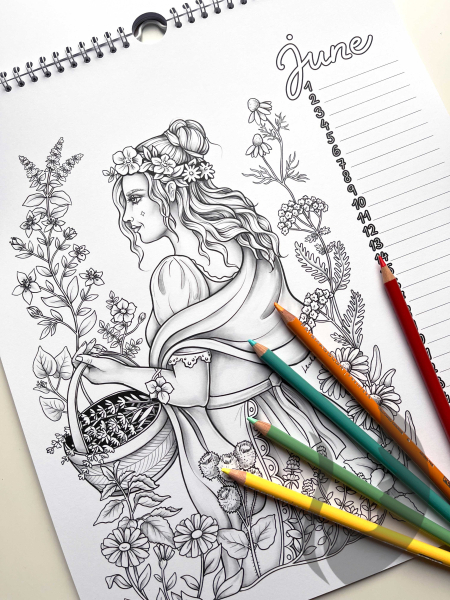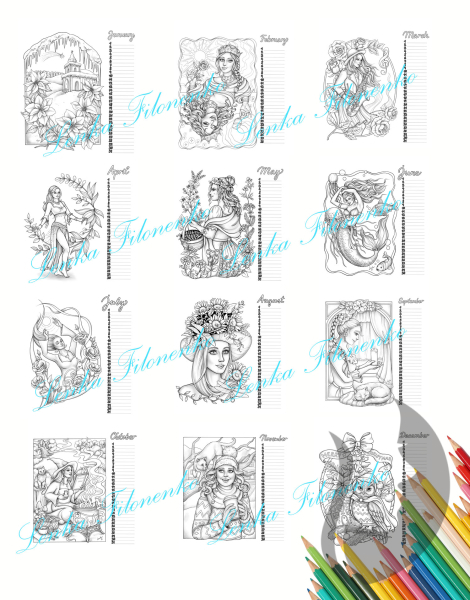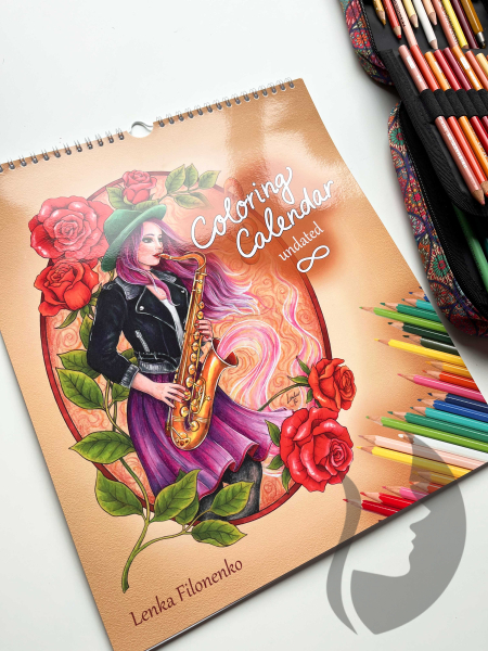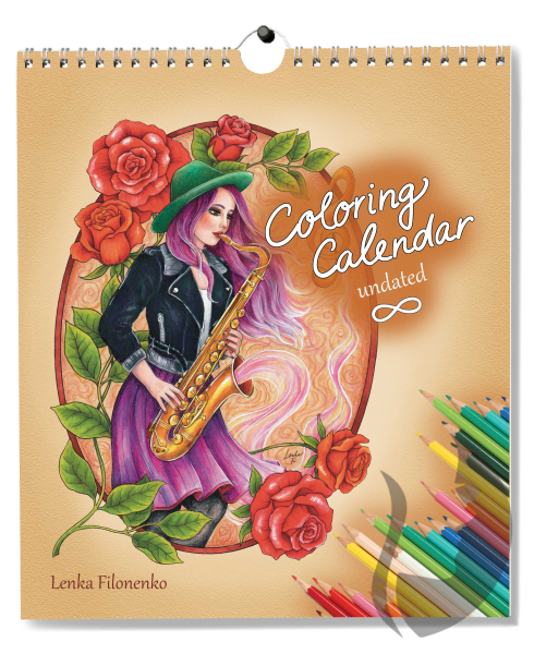 Nástěnný kalendář vybarvovací - nedatovaný. Kalendář je s novými obrázkami, které Lenka kreslila pro Patreon, všechny dosud nepublikované. Je nedatovaný. Nejsou v něm názvy dnů, jen v každém měsíci čísla 1-31 a řádek pro zapsání poznámek. Dá se tedy používat kterýkoliv rok