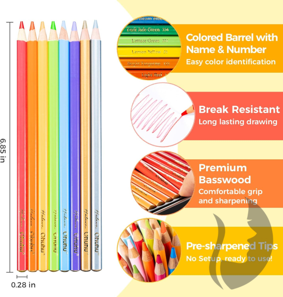 Ohuhu jsou vysoce kvalitní pastelky, které se krásně vrství a míchájí a stínují bez rozmazaní. Jedná se o umělecké pastelky určené jak pro amatérské tak pro umělecké kreslení. Jsou na olejové bázi, vodou nerozmývatelné (ale můžete použít minerální líh :-)). Na tělu pastelky je napsané jméno barvy. Mají 4 mm měkké jádro a jsou kulatého tvaru. Součásti jsou dvě metalické barvy stříbrná a zlatá, které jsou oblíbené.